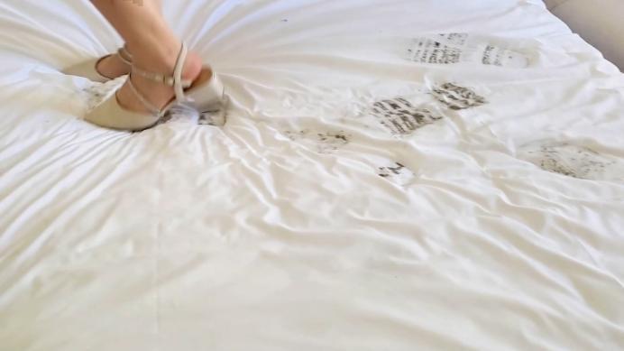 02年设计师妹子江棠和03年学生妹子盼姿一起踩脏床铺和床上的枕头,鞋上特地沾了灰尘,踩在床上鞋印很明显