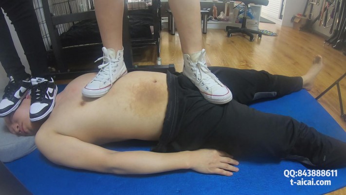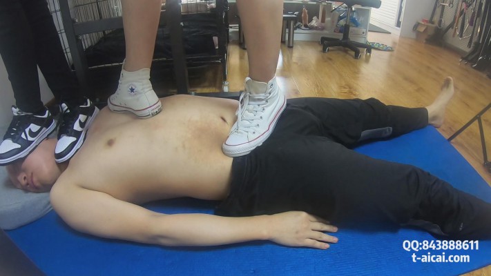 微微和闺蜜一边聊天,一边无情的踩踏脚下的小M,声音相当的甜美, 先穿着耐克板鞋踩,后面换上高跟鞋继续踩,最后疼的小M不停喊叫。